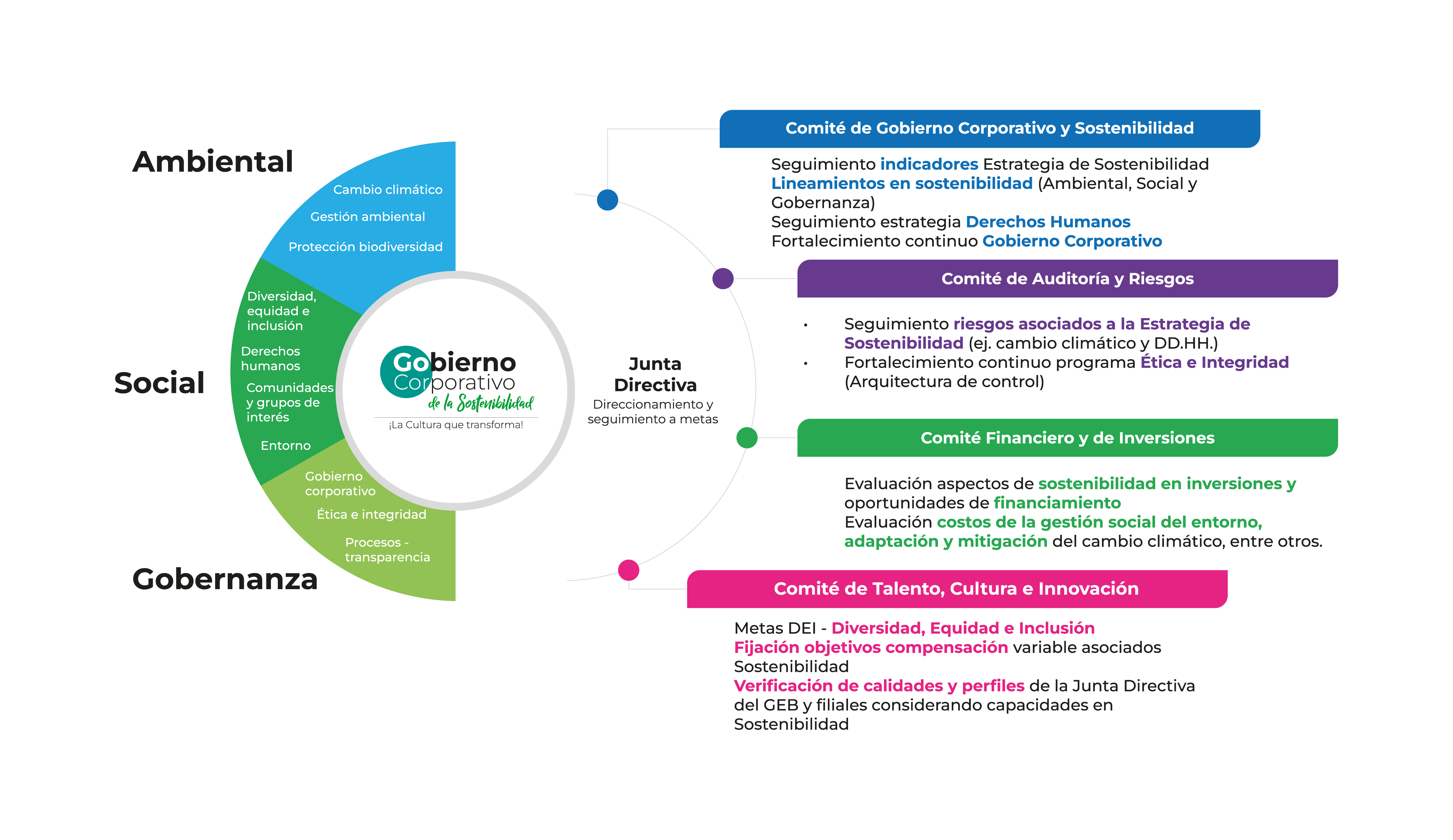 - Under the leadership of the Board of Directors and with the commitment of all its shareholders, a Comprehensive Corporate Sustainability Governance System was adopted, whose purpose is to direct and promote the Sustainability Strategy throughout the Business Group, developing tools to monitor the goals set in the Corporate Strategic Plan and identify the risks and opportunities in the face of the challenges faced by the different businesses.