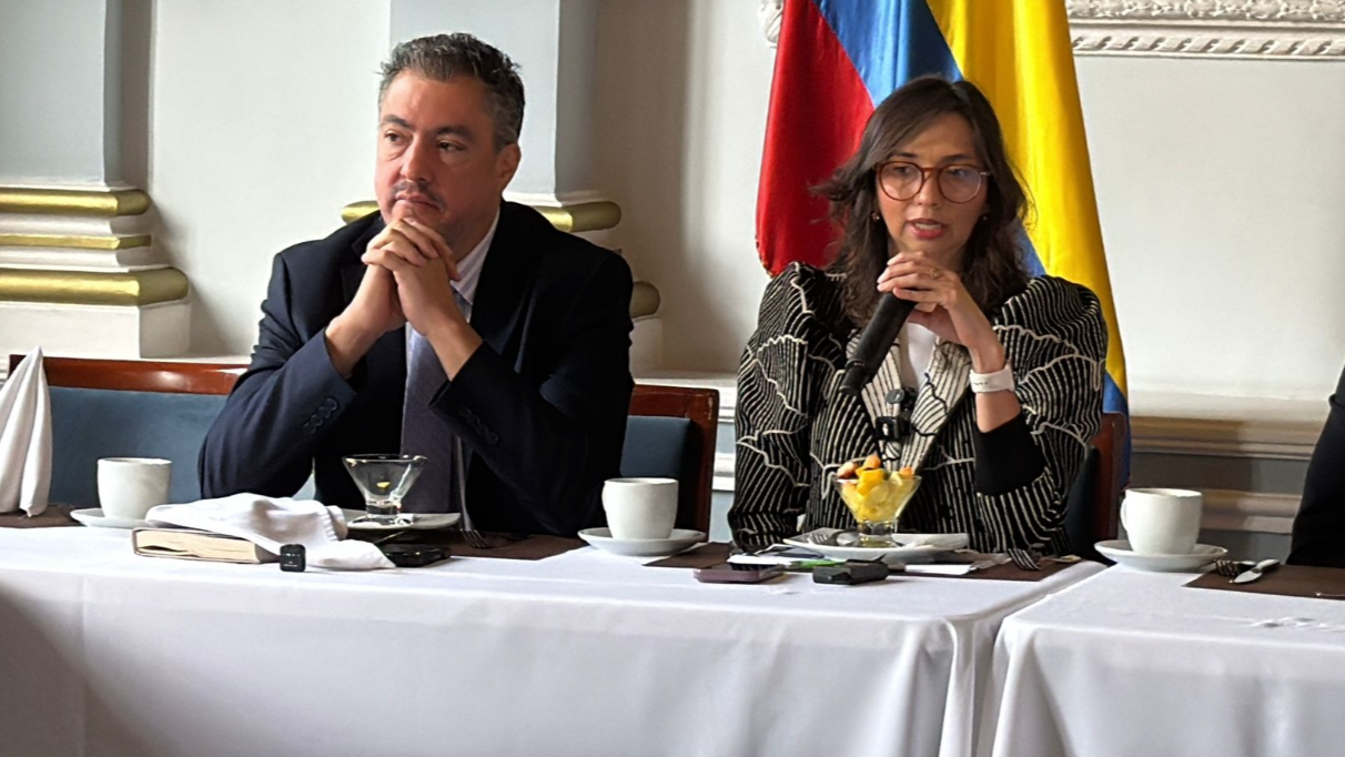 Juan Ricardo Ortega, presidente del Grupo Energía Bogotá y Ana María Cadena, secretaria de Hacienda de Bogotá, explican ante los medios de comunicación el proceso exploratorio relacionado con la participación accionaria del Distrito en el GEB.